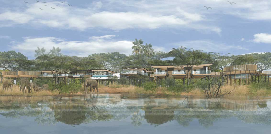 The lodge will sit on a series of stilted wooden structures to provide the lightest possible footprint while still being capable of withstanding a heavy knock from a passing elephant. Fabricated off-site to minimize construction impacts, the arrangement of lodges and villas will be connected by raised walkways and bridges.
