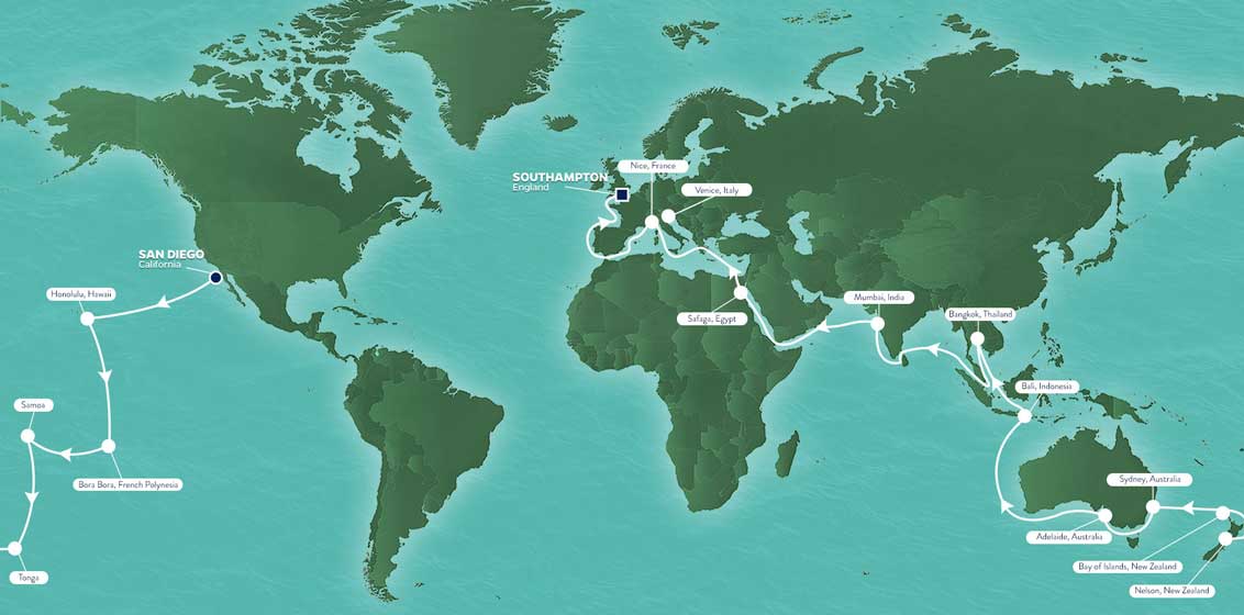 The 2025 World Voyage is comprised of 10 segments which can be sold individually. They consist of: