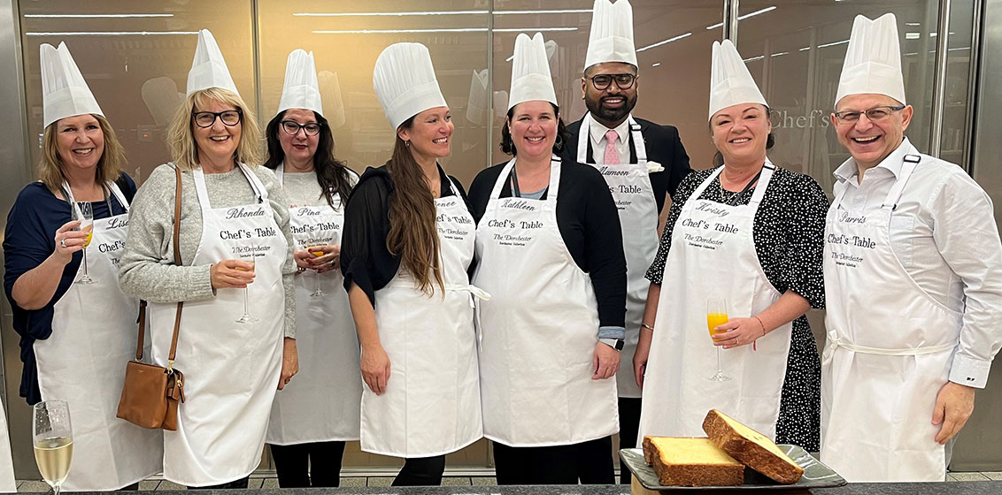 Lead image: Breaking bread during a breakfast masterclass at Chef’s Table, The Dorchester from left are: Lisa Maddox, Spencer Travel – Leisure; Rhonda Singh, Coastal Travel; Pina Azzaro, Y Travel; Renee Duncan, Platinum Escape; Kathleen Nicholson, TTFN; Mamoon Rahman, The Dorchester, 45 Park Lane and Coworth Park; Kristy Williams, Solve Travel Management and Parris Fotias, Dorchester Collection.