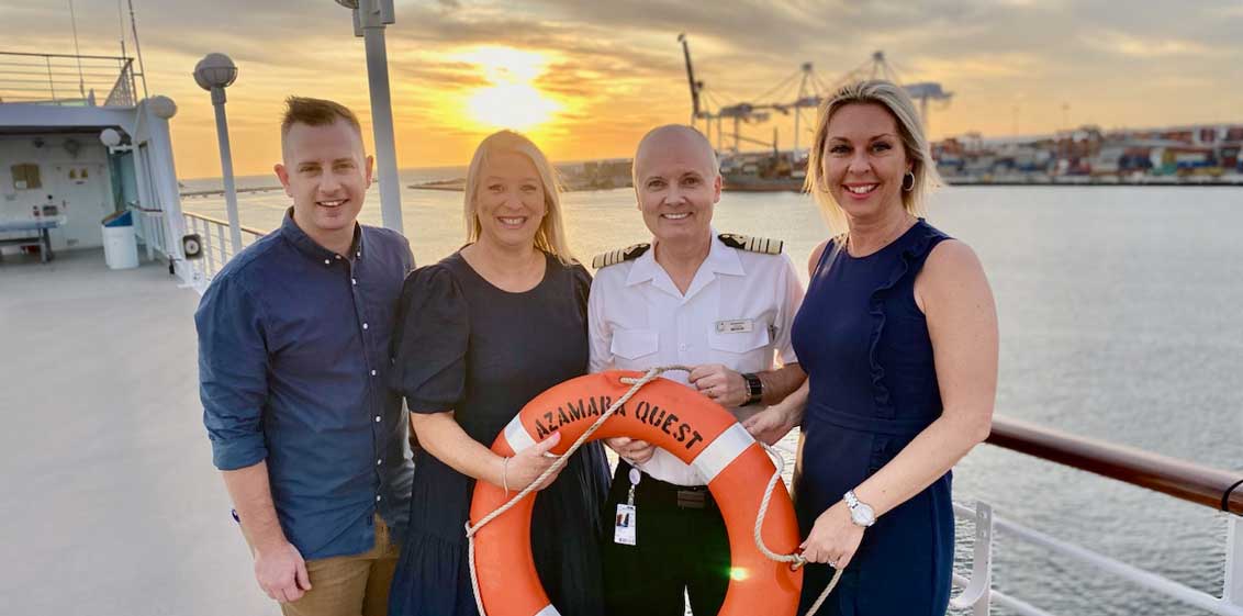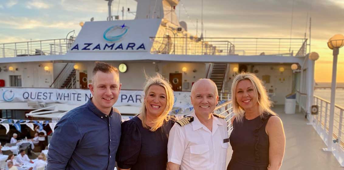 Lead image: Aboard Azamara Quest, and having missed the White Night marketing brief, from left are Azamara’s Daragh Robbins, Virginia Chigwidden, Captain Johannes Tysse and Kristina Sambaher.
