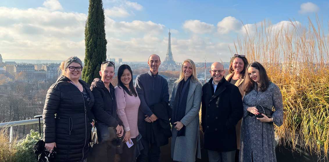 Lead image: Belle Etoile Penthouse Suite – outside on the private terrace soaking in the 360-degree views of Paris, from left are – Philippa Enright, Davis & James Travel Associates; Melissa Madigan, Jones & Turner Travel Associates; Pintip Suthayakhom, Reis & James Travel Associates; Nathan Dare, Dare & Turner Travel Associates; Parris Bohun, Etihad Airways; Parris Fotias, Dorchester Collection; Stephanie Shanahan, O’Sullivan & Turner Travel Associates; and Irina Epikhina, Hotel Plaza Athenee and Le Meurice.