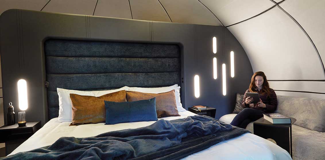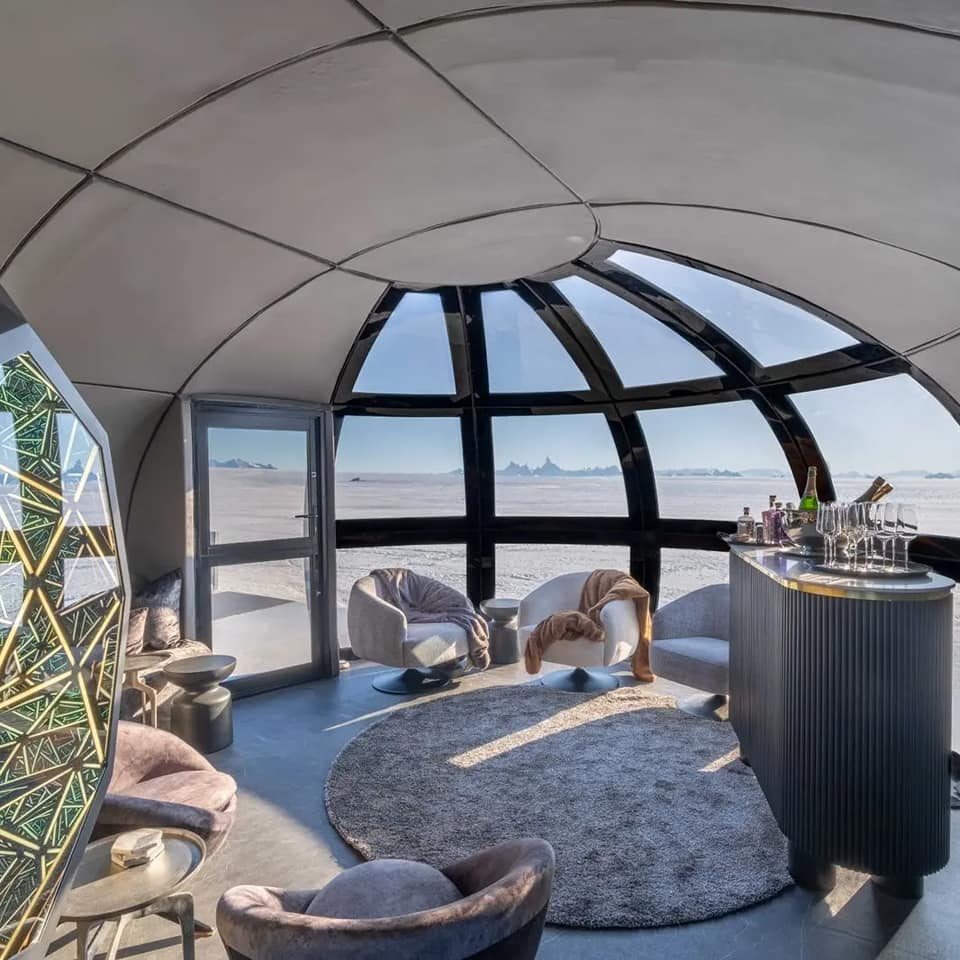 “Futuristic and luxurious, the six bedrooms are created from composite fibreglass with floor-to-ceiling windows allowing guests to soak in the moon-like landscape beyond.”