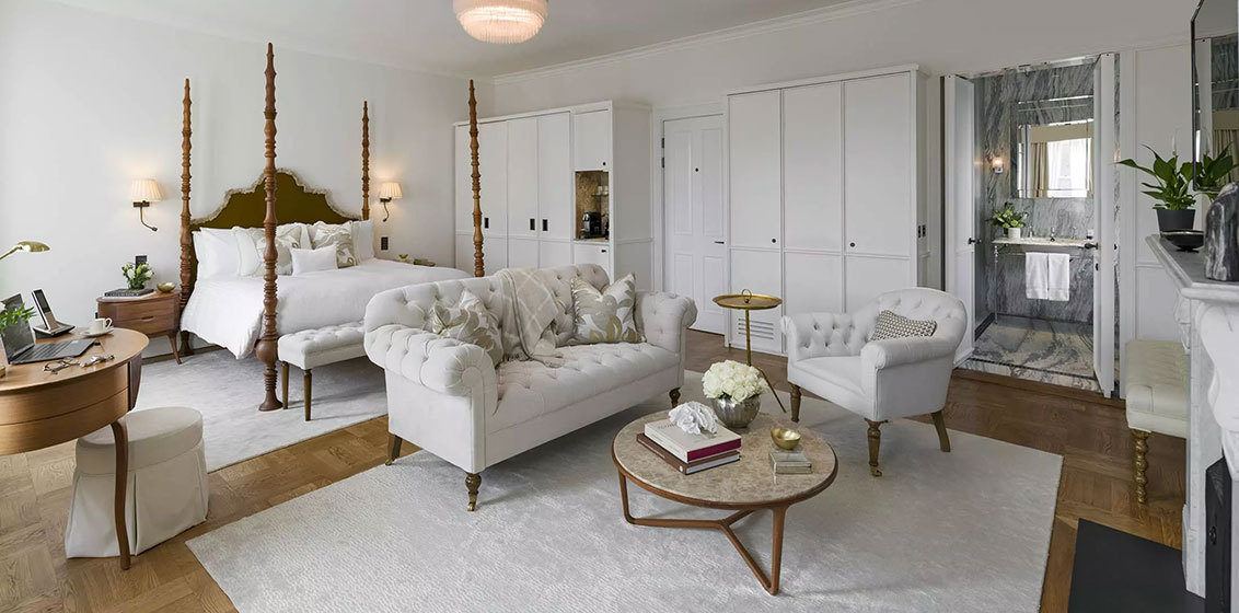 Elizabeth, up 90 carpetted stairs for those who eschew the elevator, is themed for Queen Elizabeth II, with a larger-than-life wall-hung collage of her unmistakable silhouette, crown atop. There’s a four-post bed, with no top tester. You have superbly rich double-chocolate biscuits, by Border. The tea kettle is Smeg, the toiletries are quintessentially English, Bamford. This lesson in national mores is enhanced by the really deep soaking tub, which has Victorian plumbing in the form of a baton-like waste stopper that has a mind of its own.