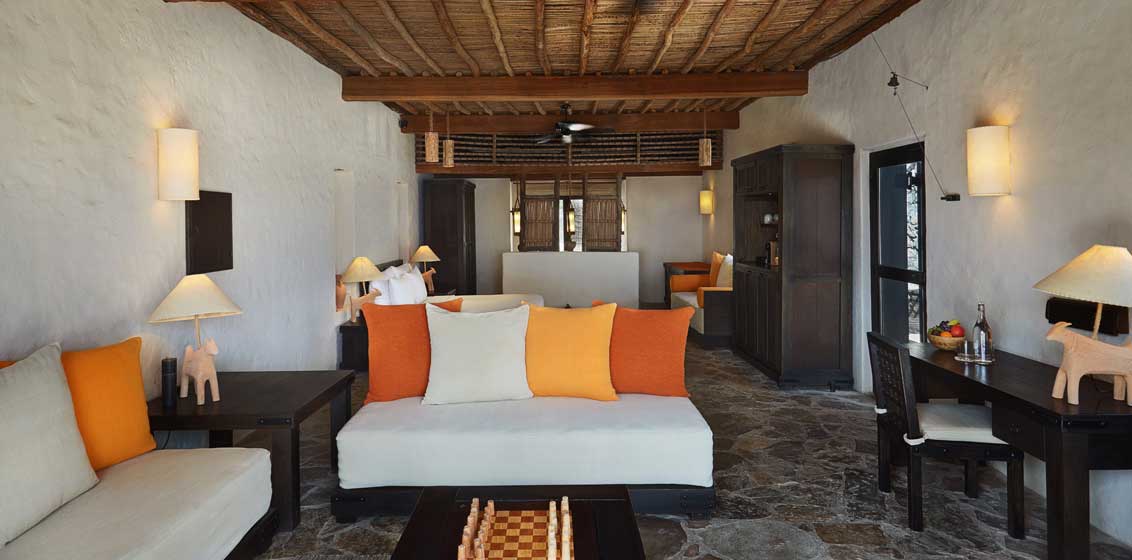 Spread out throughout the ‘village’, Six Senses Zighy Bay has 82 detached single-story villas built of local Nizwa stone. Floors are large smoothed rocks, embedded in cement. Overhead are flat date-palm roofs. You have heated swimming pools and peripheral privacy fences (more date-palm). Inside, sustainability meets rustic chic. Refillable glass water bottles and filled Homeinno wine fridges supplement complementary minibars, espresso machines and instant, excellent WiFi.