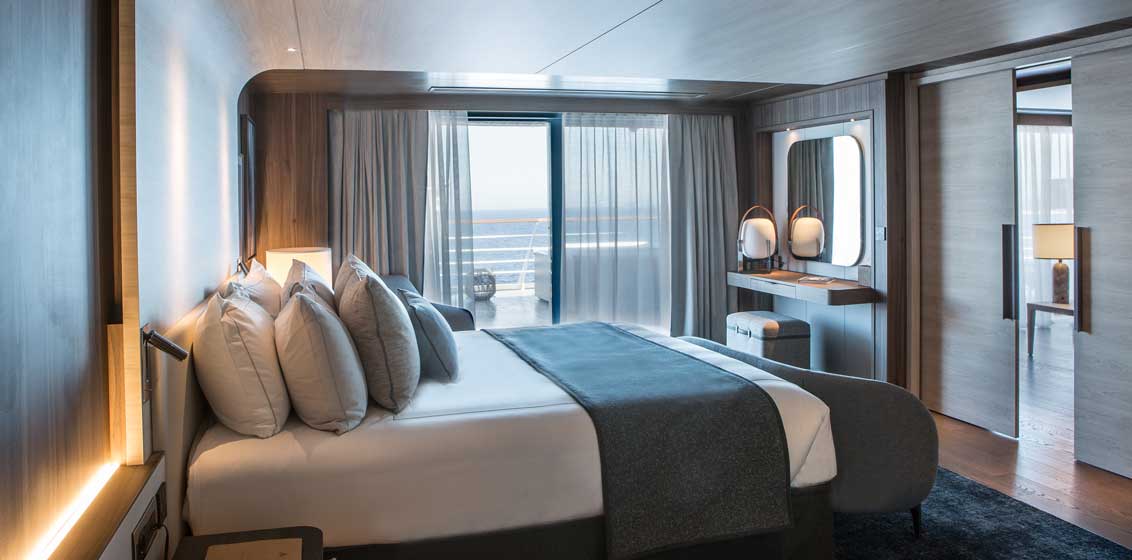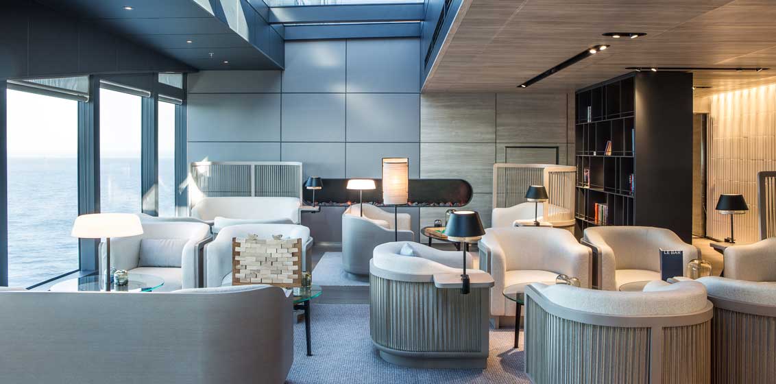 Charcot has five guest decks, 123 staterooms and suites, all with private balconines or terraces. Among the accommodations are four 94 sqm split-level duplexes at the rear of decks 6 and 7 with outdoor jacuzzis, and an enormous Shipowner’s Suite on deck 8 spread out over 115 sqm and with a whopping 186 sqm private terrace. Guests will also find two restaurants, a main lounge, a theatre and a spa with its own snow cave, alongside expedition equipment that includes 16 Zodiacs and a helicopter.