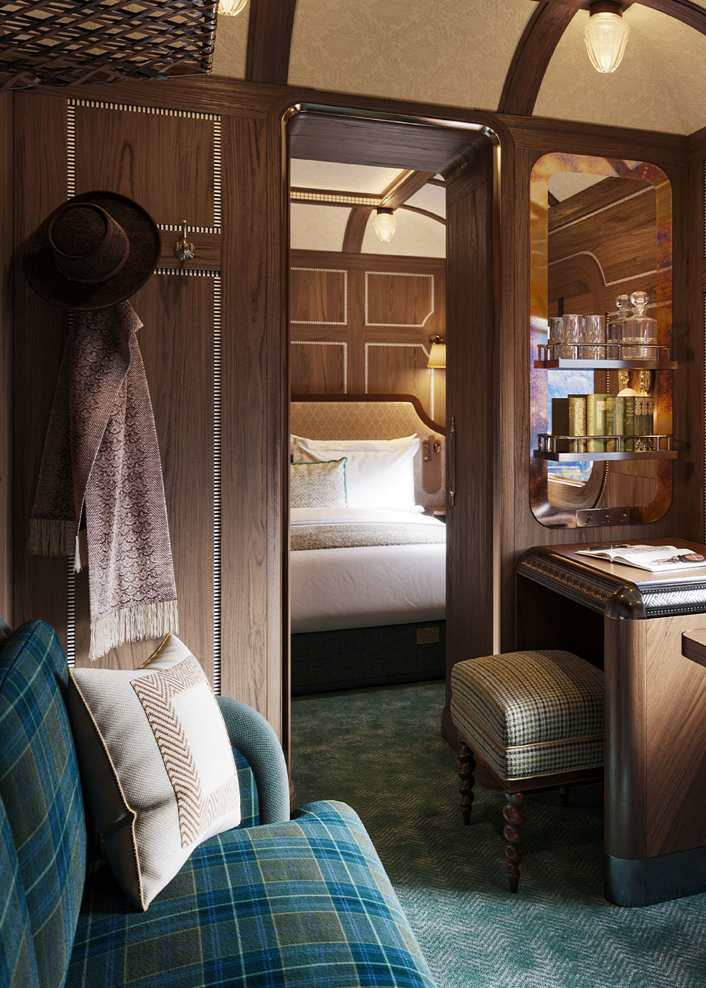 Taking pride in Belmond’s role as a custodian of timeless craftsmanship, the beautiful armchair located in the day lounge area is a tribute to the Orkney Chair; an iconic piece of furniture originating in the namesake Scottish archipelago over a century ago. Traditionally handmade with driftwood gathered from the shoreline and with no set design instructions, no chair is the same – for the Grand Suites, the Scottish design staple has been interpreted in a new, more contemporary light, and upholstered with the finest textiles from iconic Scottish brand, Araminta Campbell to match the unique elegance of the Royal Scotsman.
