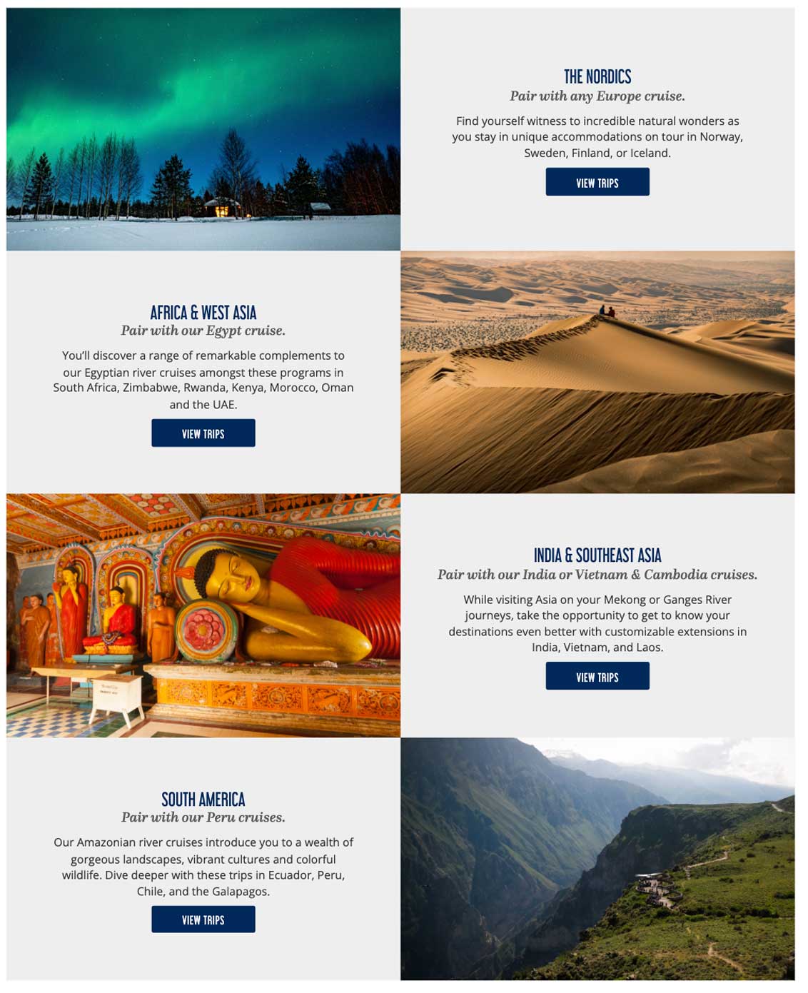 From any of Uniworld’s European cruises, guests can choose experiences such as a 4-night Scenic South Iceland from Reykjavik, an 8-night Arctic Lights trip to Oslo and Finland, or a 9-night trip to Norway. Egypt cruises can be paired with extensions in Southern Africa (to Kenya, Rwanda, and Zimbabwe), or Morocco and the Arabian Peninsula.