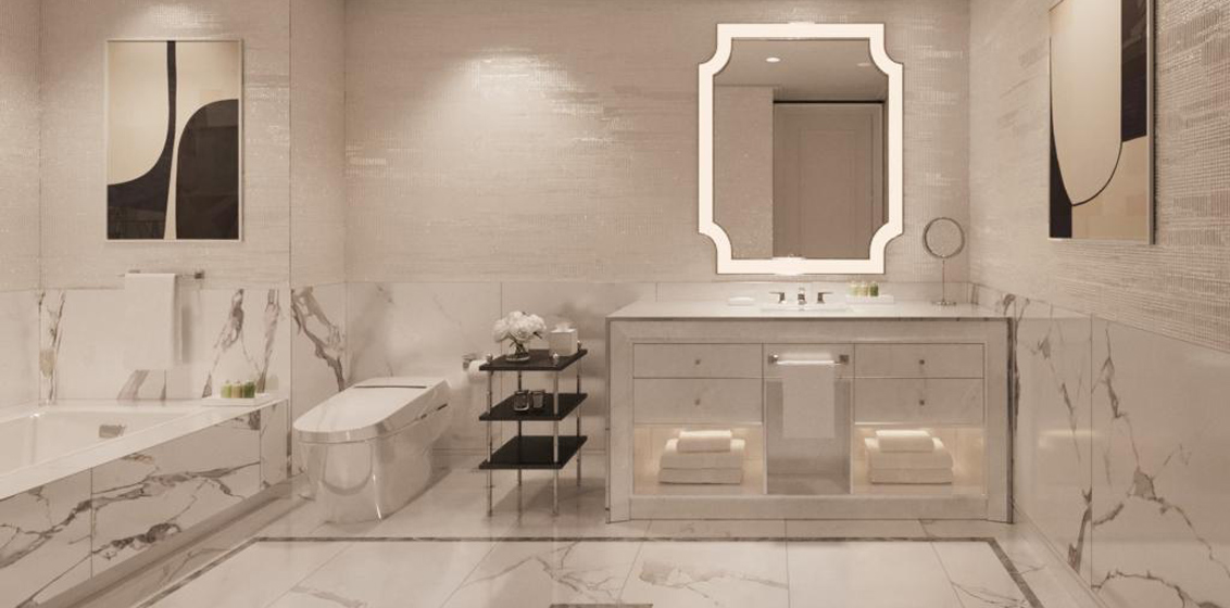 Within the suites’ luxe bathrooms, guests will find custom vanities thoughtfully integrated with lighted mirrors and upscale white marble surfaces, as well as motion-sensor lights for convenience and comfort.
