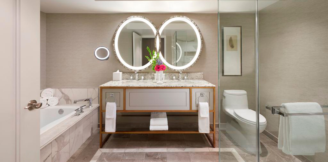 The King Room will feature a palette emulating the sunrise reflecting on the water in a symphony of blues and greens. The Spa Tower’s Two Queen Room is designed around a lake sunset, integrating deep, calming tones with flickers of gold and amber. Both designs encompass strong, bold elements that are soothing and calming for guests either beginning or ending their day. Elevated design elements including luxurious marble floors, custom furnishings, illuminated bathroom mirrors inlaid with mother of pearl, and a separate soaking tub and shower will be the hallmark of the new guest room experience.