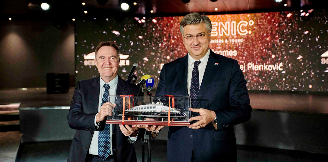 Scenic Group Chairman and Founder Glen Moroney showcased the €170 million six-star Scenic Eclipse II to Croatian Prime Minister Andrej Plenković after it was delivered to the Australian cruise and travel company last week. The presentation of the second Discovery Yacht – which cut its first steel inside three years ago and was entirely built in Croatia – was made ahead of the sail away from the 3 Maj Shipyard in Rijeka on Thursday.