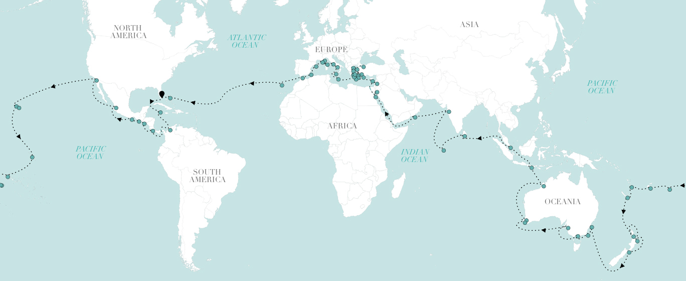 The cruise travels around the world, providing guests the opportunity to visit island paradises, famous coastal cities and ancient landmarks in destinations such as Colombia, French Polynesia, Australia and New Zealand, Singapore, Indonesia, India, Egypt, Jordan, Italy and the French Riviera.