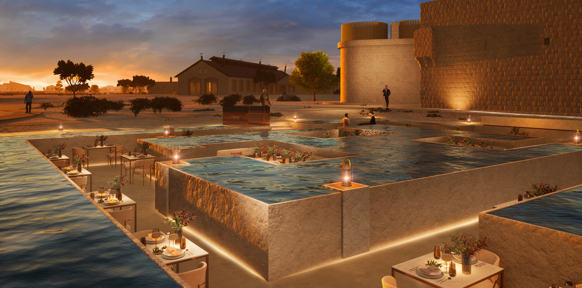 The on-site restaurants will each offer unique experiences for hotel guests and others visiting Hegra. One of the restaurants inside the old railway station will feature an exhibition of carefully preserved artefacts, including a fully-restored train, while another will sit within the Hegra Fort, and a third will feature unobstructed views from a sunken water basin seating area.