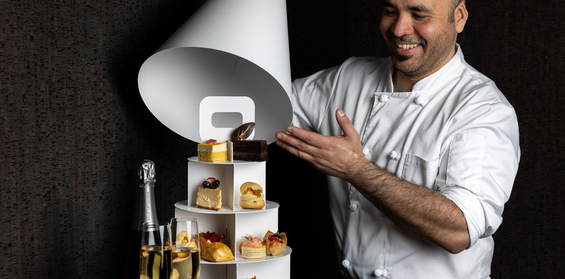 For sweets, there’s a traditional New York-style Cheesecake with juicy, fresh berries; gluten-free Infinity Cake with fine 70% cacao chocolate; and divine Pecan and Chocolate Tarte. Assorted colourful macarons top the tier.
