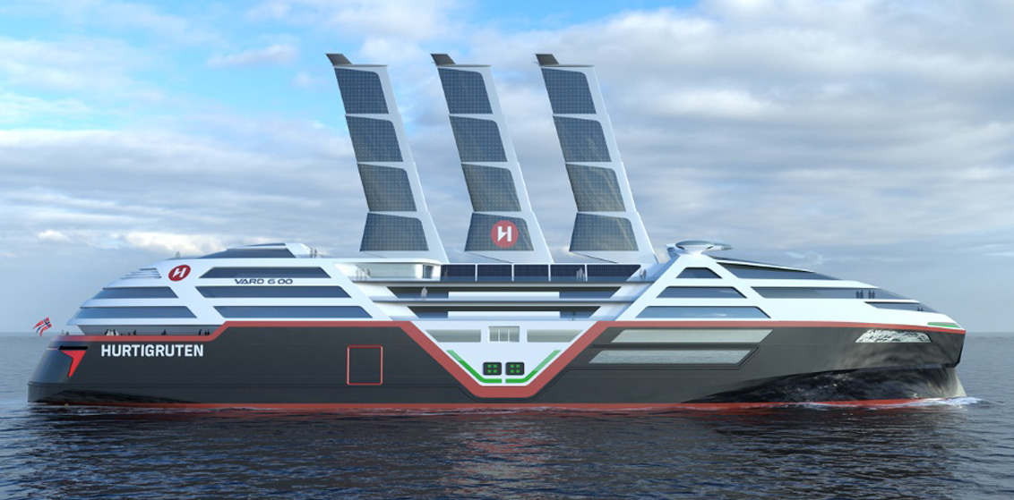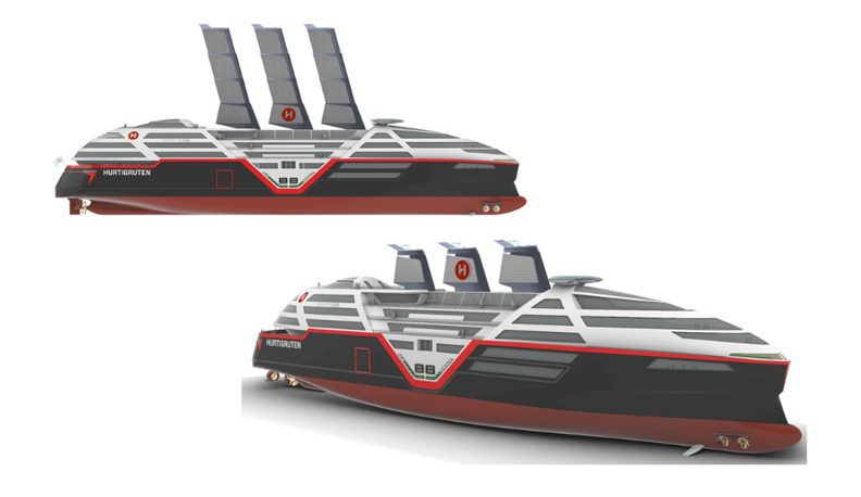 Hurtigruten Norway has unveiled plans for its first zero-emission electric and wind-powered ships, featuring retractable sails, slated to enter service in 2030. The new ship will be 135 meters long, and comprise 270 cabins, with a capacity of 500 guests and 99 crew.