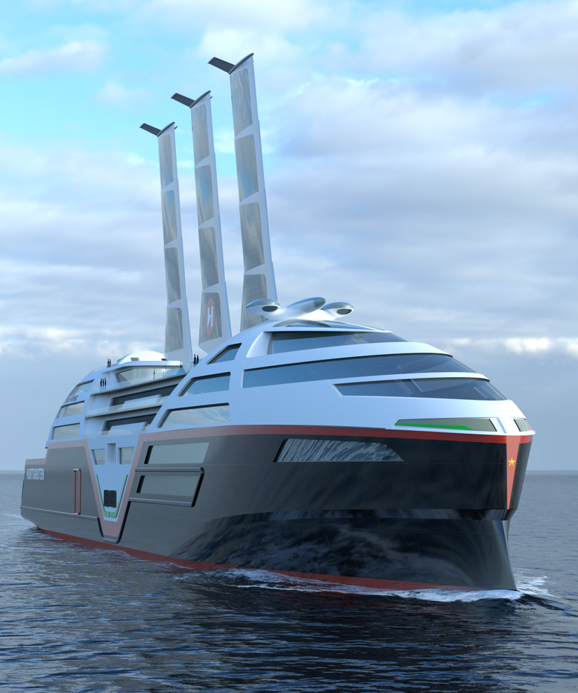 The three retractable, autonomous wing rigs will comprise 1500 square-metres of solar panels and a total wind surface of 750 square metres, reaching a maximum height of 50m when fully extended.
