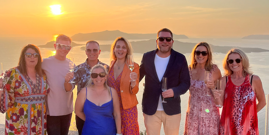 Lead image: Santorini sunset – one of the highlights of the famil was an inspection, with champagne and canapés at private villa Nafsika Estate.