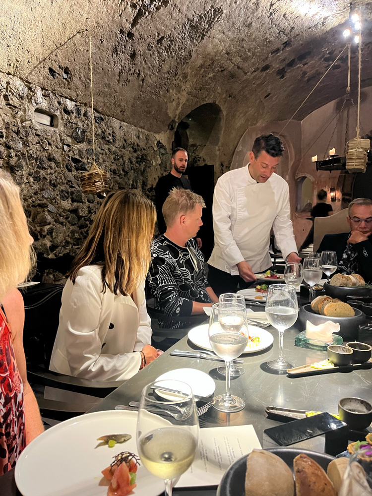 The group tried their hand at a cooking class hosted by sister property Andronis Concept – there was definitely a culinary theme on this fam trip – dinner in a 400-year-old wine cave located at Vedema, a Luxury Collection Resort followed an incredible sunset from private villa Nafsika Estate, complete with champagne and canapes.