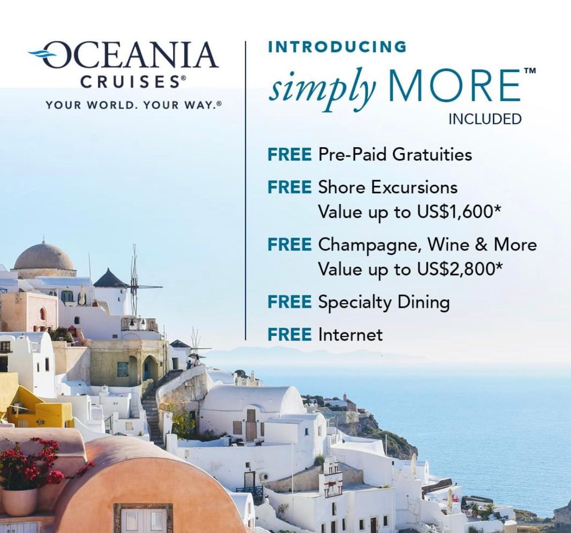 simply MORE includes beverages such as champagne, beer and wine with lunch and dinner, shore excursion credit, pre-paid gratuities, onboard wifi and specialty dining.
