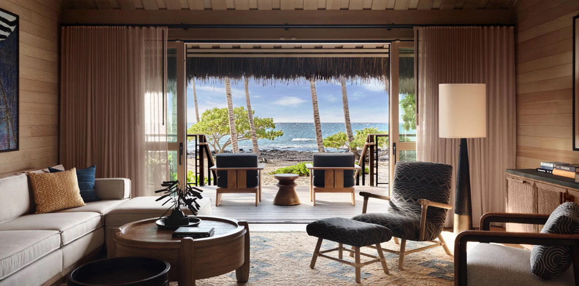 The revisioning of Kona Village, A Rosewood Resort was guided by Rosewood’s partner Kennedy Wilson, the innovative global real estate investment company renowned for its commitment to responsible and sustainable development on Hawaiʻi – over 80% of materials salvaged repurposed and brought back to the island as affordable building materials.