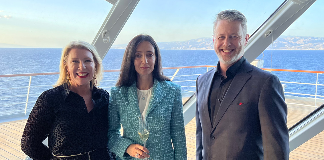 Lead image: Sailing aboard Crystal Serenity off the coast of Calabria, Italy are Debra Fox, MD A&K Australasia/EVP Trade Sales APAC A&K & Crystal; Christina Levin, CEO A&K Travel Group/Crystal and Tony Archbold, Vice President of Sales APAC, Crystal.