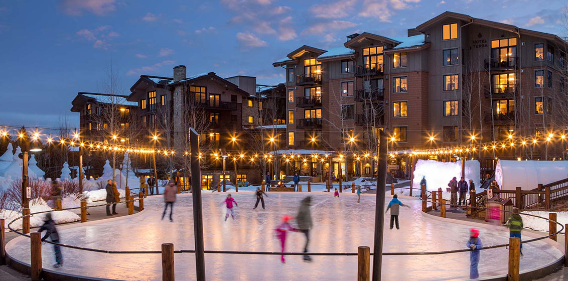 navigate the snow, both cross-country skiing and snowshoeing around the area are possible with rentals found at JH Sports. Ice skating in the heart of the village is also an easy possibility, complete with rental skates, snacks, and warm drinks at the warming hut adjacent to the rink.