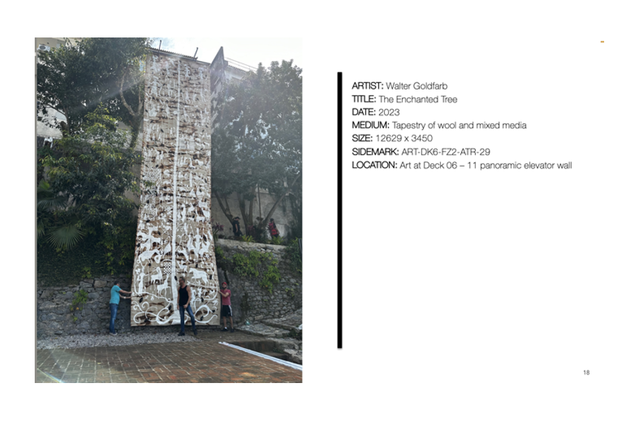The close to 40-foot-tall tapestry, “The Enchanted Tree”, will hang adjacent to the elevator wall in the ship’s lavish atrium on Deck 6, giving multiple vantage points of this breathtaking feat of intricately woven textiles.