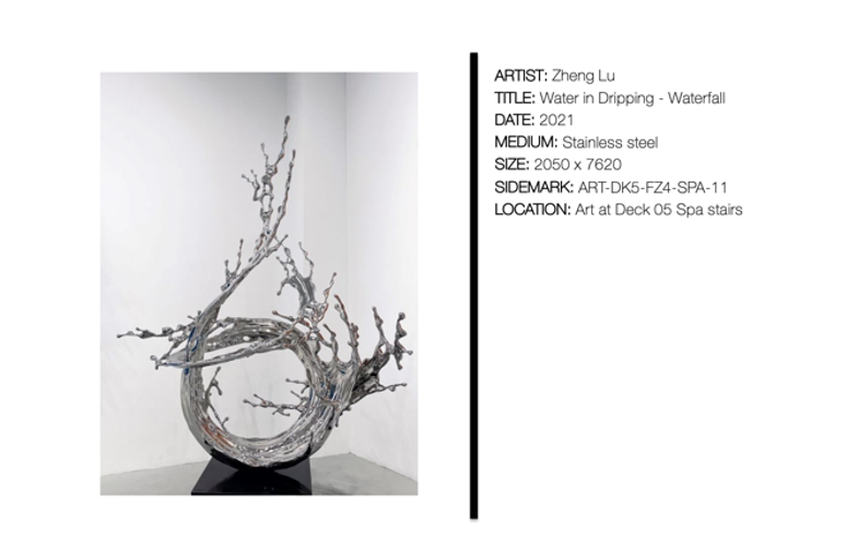 The stainless-steel sculpture “Water in Dripping – Waterfall” by Zheng Lu can be found at Serene Spa & Wellness on Deck 5.