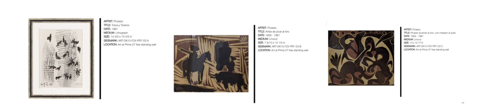 - Pablo Picasso (Lithograph and Linocut). “Toros y Toreros”, “Antes de picar al toro” and “Picador picando al toro, con matador al quite”