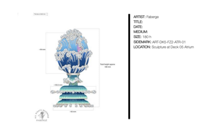 The highly anticipated art collection has been a topic of discussion since the exterior design of the first piece of art, a commissioned Fabergé Egg, ‘Journey in Jewels’, was unveiled last year. The first and only Fabergé Egg to reside permanently at sea, the interior design and mechanisms of this one-of-a-kind piece remain cloaked in mystery and will be revealed alongside the full art collection during Seven Seas Grandeur’s christening in Miami this December.
