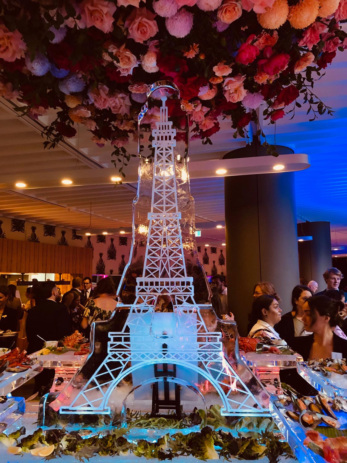Guests were met with a woman wearing a Champagne skirt filled with glasses of Pommery and an Eiffel Tower ice sculpture, then feasted on exceptional cuisine created by a team of chefs who served up mouth-watering Portobello steak, Wild venison loin, Char-grilled octopus, Pork cutlet, not to mention a huge Seafood Buffet that included Australian rock lobster, Chilled tiger prawns, Premium sushi and freshly sliced sashimi, while waiters poured endless glasses of French champagne.