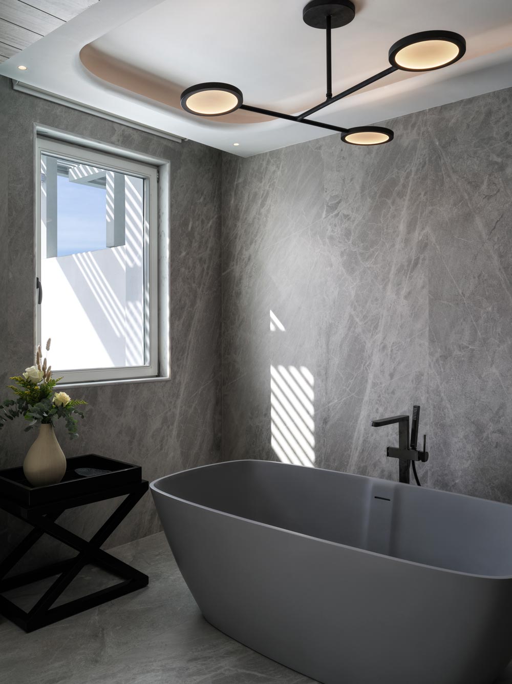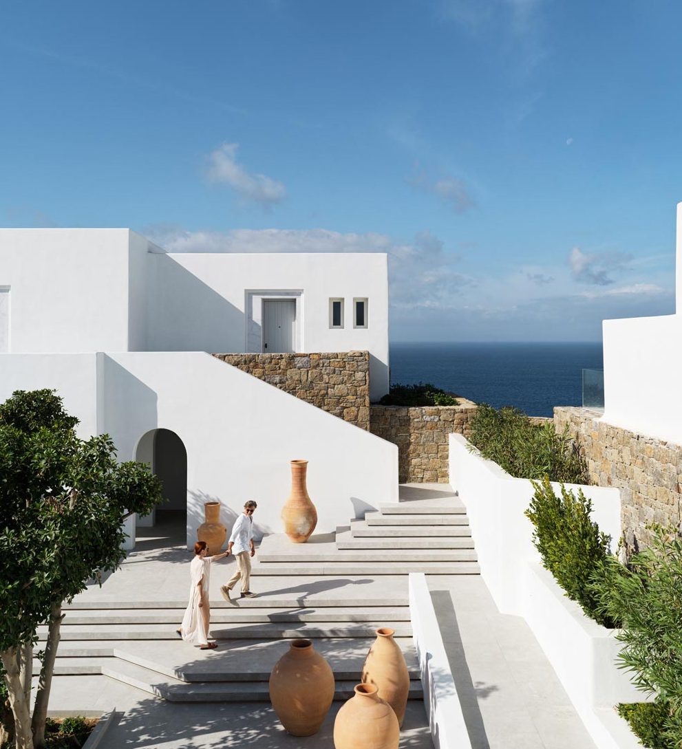 If Deos has an ethos, it is to merge inner and outer spaces holistically, and the architecture has artfully established conditions for flow. A contemporary Cycladic line intimately follows the landscape and enhances its connection with accents such as the rustic walls made from rocks quarried on site, the generous planting of indigenous flora, or scenic apertures that selectively frame the view.