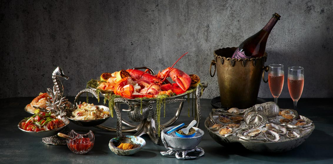 Humuhumunukunukuāpuaʻa offers a tailored guest experience with signature services and rituals, such as a customisable “seacuterie” offering with a variety of vegetables, housemade seasonal jams, grilled bread, and local butter with Maui sea salt. Behind the expansive display case, an oyster sommelier provides recommendations to suit every taste, and orders of prawns are served tableside on hot lava rock.