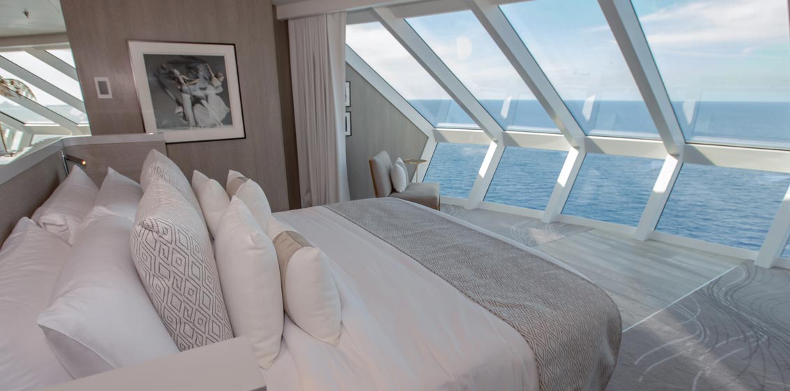 Lead image: The Iconic Suite offers panoramic views from front to back. And with over 2,500 square feet of indoor and outdoor opulence, Iconic Suites are also the most luxurious and largest in the Celebrity Cruises fleet.