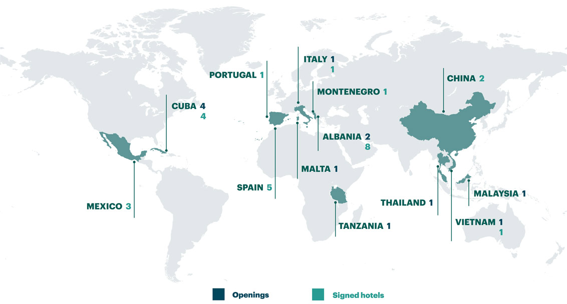 Founded in Mallorca, Meliá Hotels International has a portfolio of more than 400 hotels (existing and pipeline) in 40+ countries across 10 brands: Gran Meliá Hotels & Resorts, ME by Meliá, The Meliá Collection, Paradisus by Meliá, Meliá Hotels & Resorts, ZEL, INNSiDE by Meliá, Falcon’s Resorts by Meliá, Sol by Meliá and Affiliated by Meliá. Of those, Gran Meliá, The Meliá Collection, ME, and Paradisus play in the upmarket segment.
