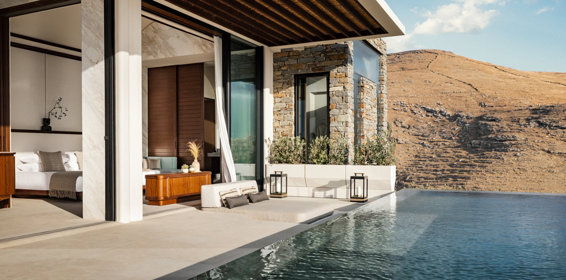 The resort’s 63 cliffside villas have been arranged to maximise privacy while showcasing panoramic views over Kéa’s dramatic landscapes and the Aegean Sea.