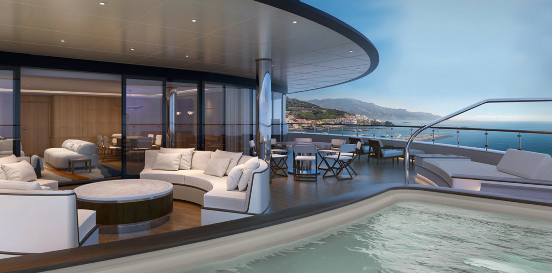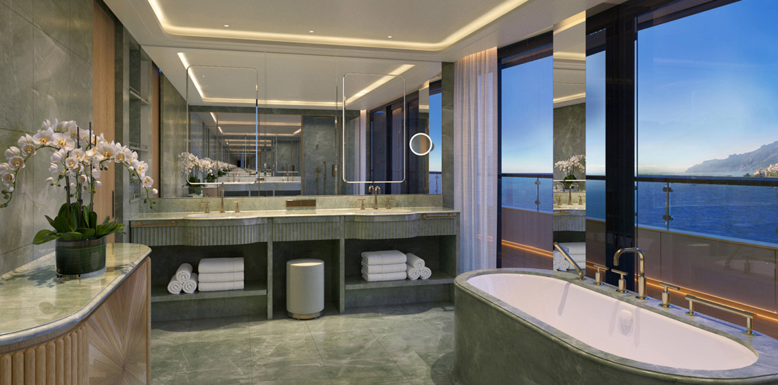 With 50% more living space per guest than currently available with any competitor at sea, all suites will offer floor-to-ceiling windows showcasing sweeping sea views, double vanity bathrooms with spacious showers and closets, expansive private terraces, and dynamic use of space and light.