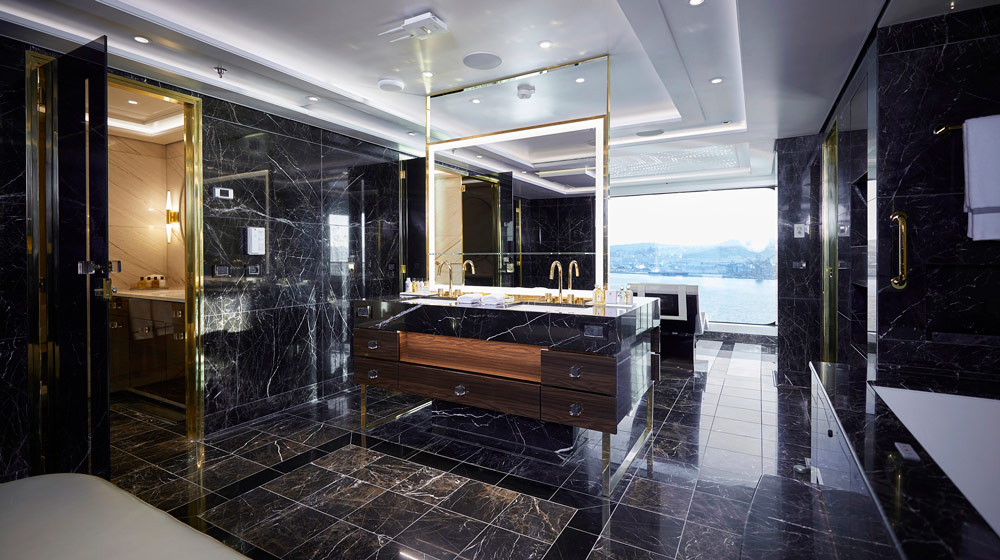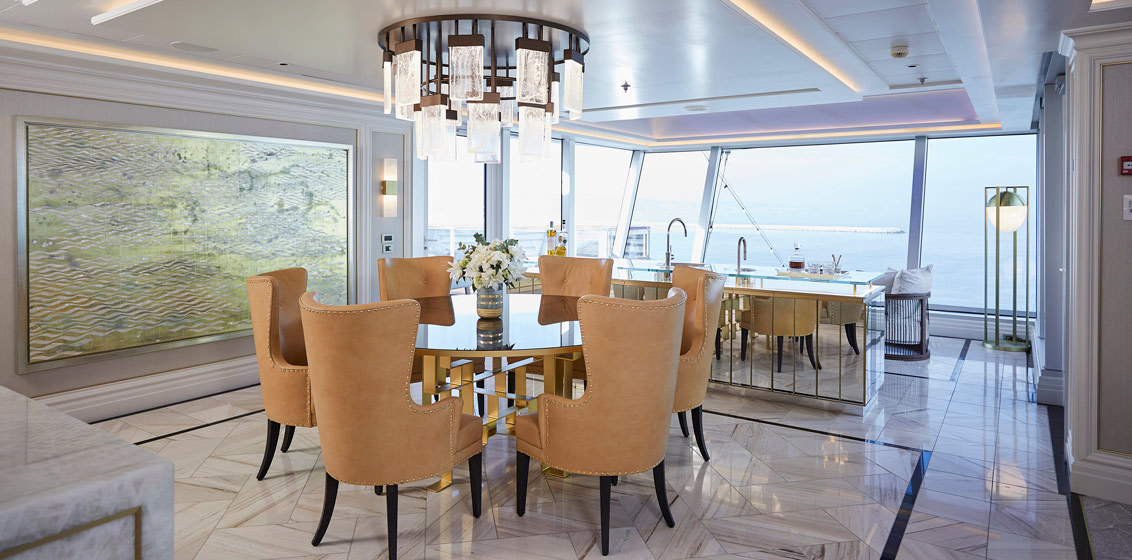 Perched on the fourteenth deck on board Seven Seas Splendor, the Regent Suite features unobstructed 270-degree views over the ship’s bow from the 1,300 square-foot wraparound veranda and a glass-enclosed solarium – offering a ‘Captain’s view’ as the ship arrives in each port. With 412 total square metres of pure elegance, the Regent Suite on board Seven Seas Splendor is one of the largest suites ever constructed on a luxury cruise ship.
