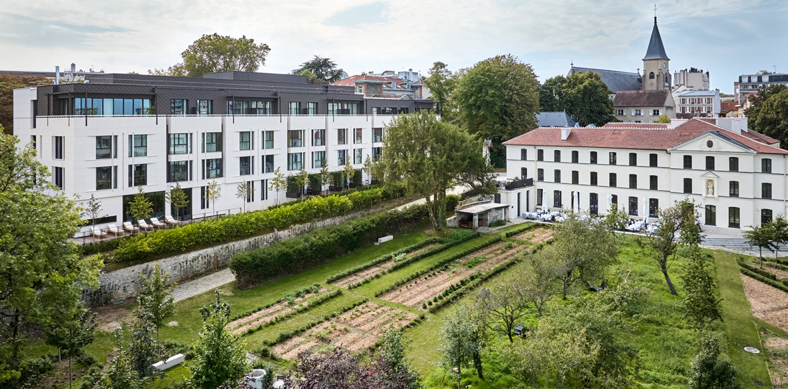 The 83 rooms and suites of the estate, whose sizes vary between 27 and 55 m², take on a refined, softened, deliberately monastic appearance. No trinkets, therefore, but tailor-made: lighting fixtures with ecclesiastical lines, contemporary dressing tables and small round tables. The keys on the top floor enjoy balconies with views of Paris, while those on the ground floor are immersed in the natural environment of the estate.