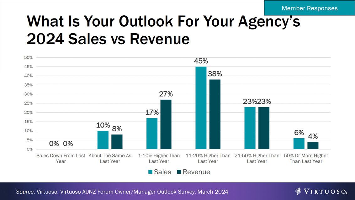 Forty-five percent of agency owner/managers foreshadowed sales would increase by 11-20% compared to 2023, a further 23% tipped sales bookings to be between 21-50% better off, while 6% estimated sales to be 50% or higher. Revenue in 2024 was flagged to increase between 11-20% by 38% of those agency owner/managers.