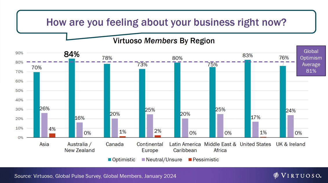 The US-based Virtuoso executive shared that 81% of agency members globally are feeling ‘optimistic’ about their business right now, down from around 87% 12 months ago. Based on the Global Pulse Survey from January 2024, the number of Virtuoso members now feeling ‘neutral’ or ‘unsure’ about their business increased to 18% from about 12% last January.