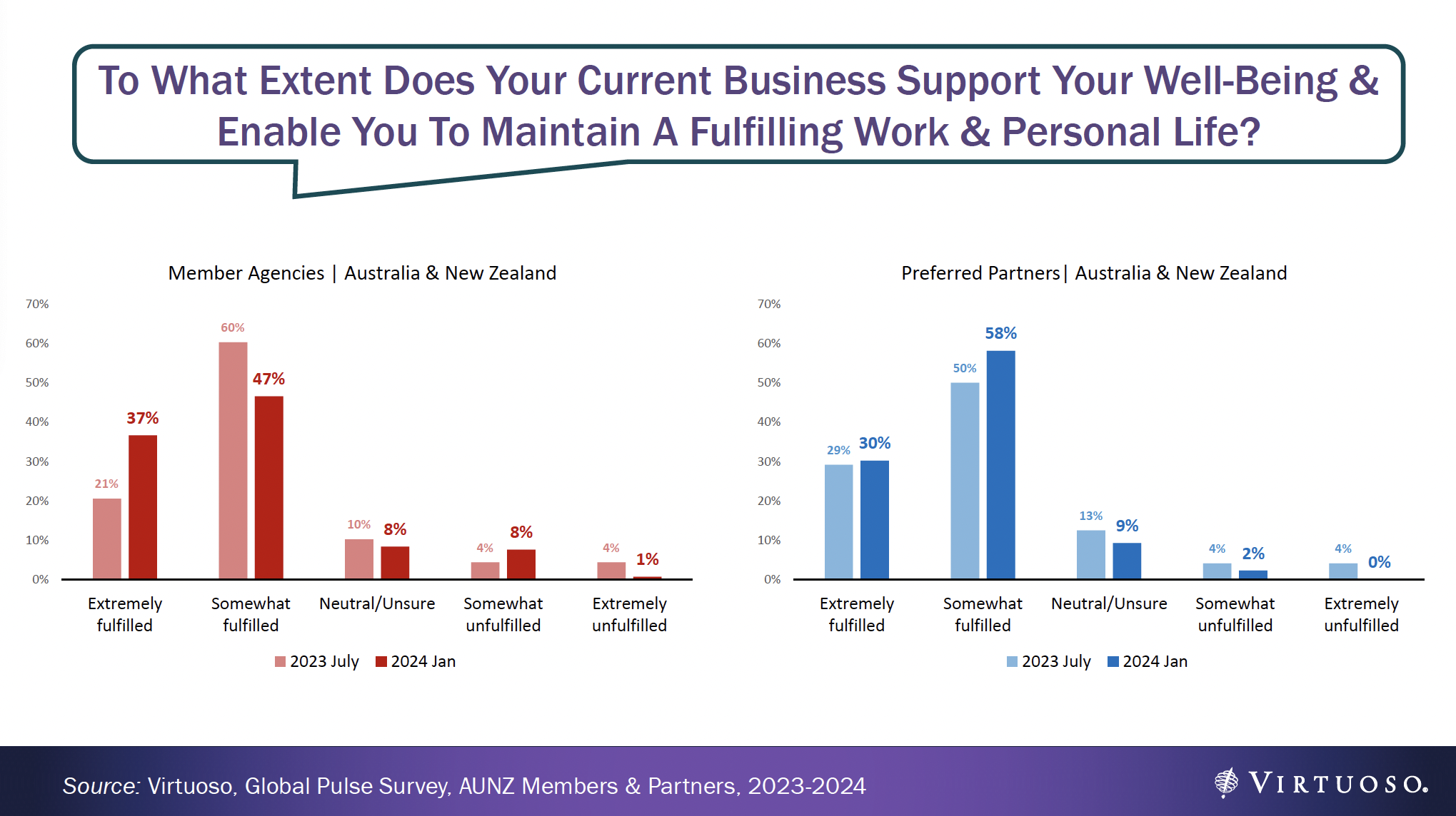 Kolner also offered insight from member agencies and preferred partners on the extent their current businesses support their well-being, enabling them to maintain a ‘fulfilling work & personal life’. While the number of agencies globally that felt ‘extremely fulfilled’ slipped one percentage point to 36% in January 2024 (compared to July 2023), the ratio of agencies in AU/NZ that also felt ‘extremely fulfilled’ skyrocketed from 21% six months earlier to 37% in January. Whereas the number of Aussie and Kiwi agencies that felt ‘extremely unfulfilled’ dropped from 4% to just 1%.