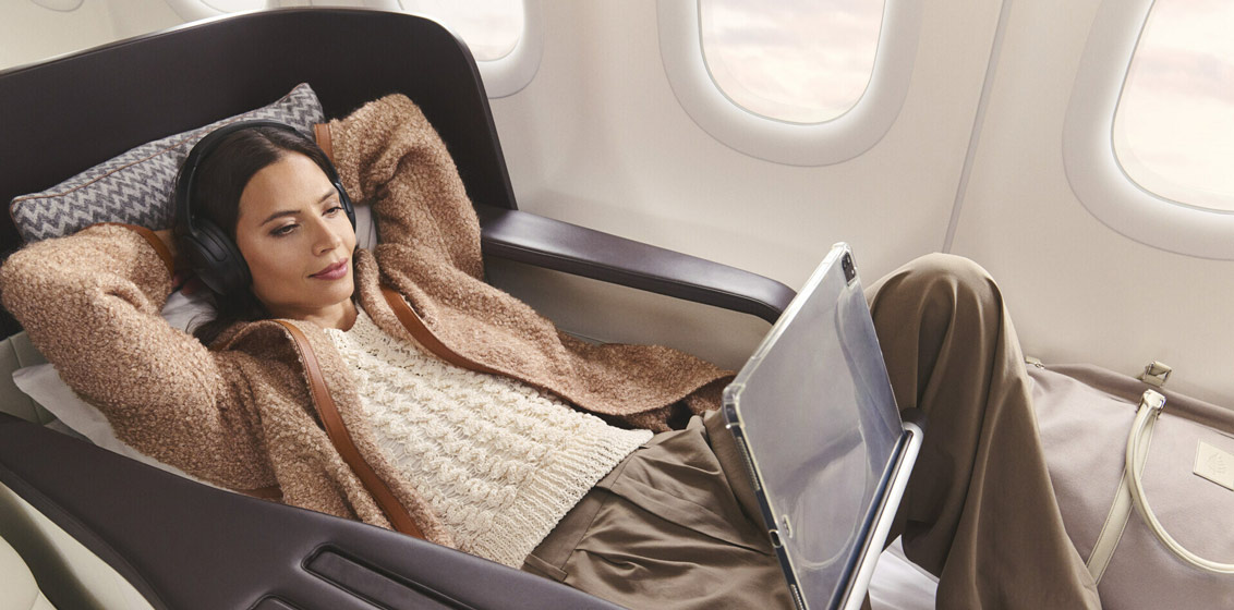 Features 48 custom-designed, spacious leather flatbed seats; each guest is provided with a personal iPad loaded with the latest entertainment as well as BOSE headphones