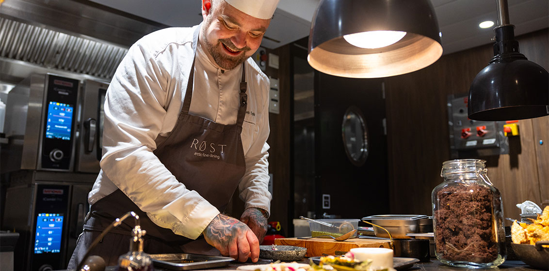 Lead image: Head Chef Douglas Spiik preparing food for Hurtigruten’s guests onboard MS Trollfjord’s fine dining restaurant Røst.