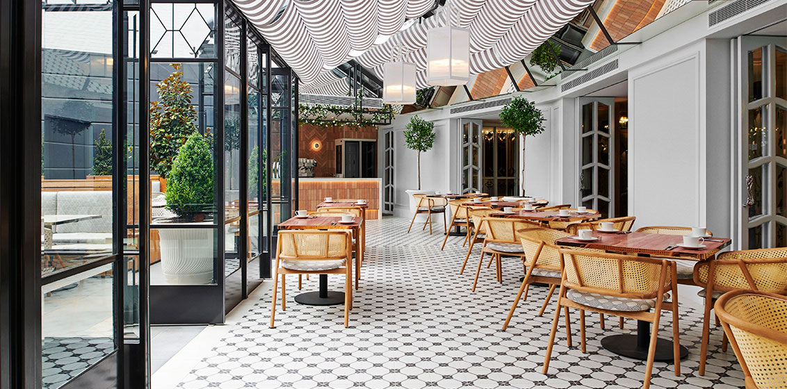 As the sun rises, guests will awaken to breakfast in The Terrace, where timber parquetry floors guide them through the bright and airy room with hues of duck egg blue and coral, taking inspiration from the delicate botanical wallpaper, imported from Barcelona, that lines the walls.
