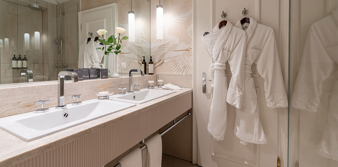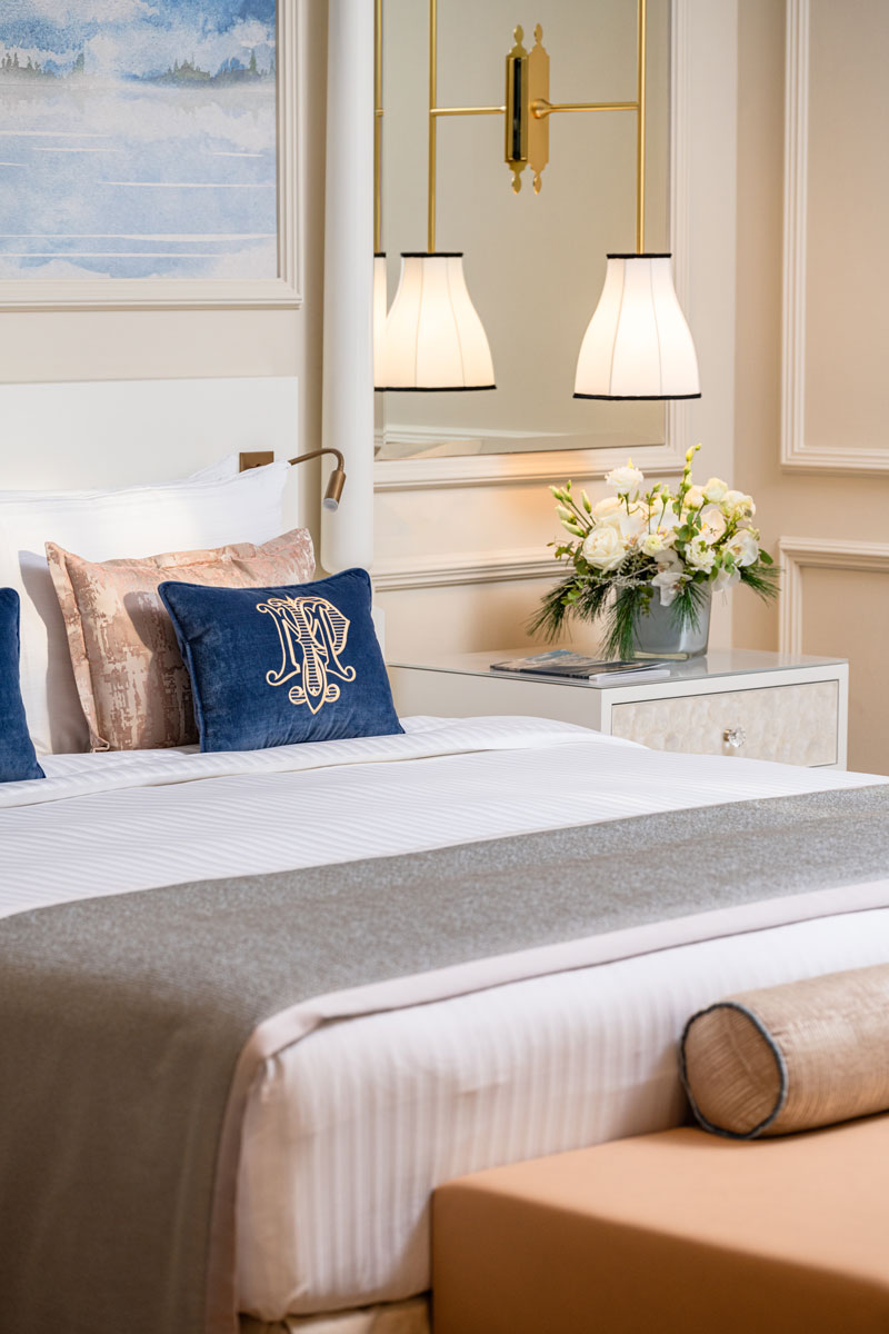 Highlights of the renovation include the preservation and enhancement of the hotel’s distinctive architectural features, such as intricate moldings and details. Solid oak floors, nacre embellished furniture, and hand-tufted carpets further elevate the guest experience, reflecting a commitment to craftsmanship and elegance. The spacious bathrooms exude a warm and romantic atmosphere with polished quartz vanity tops and custom-designed wallpaper featuring graceful water birds.