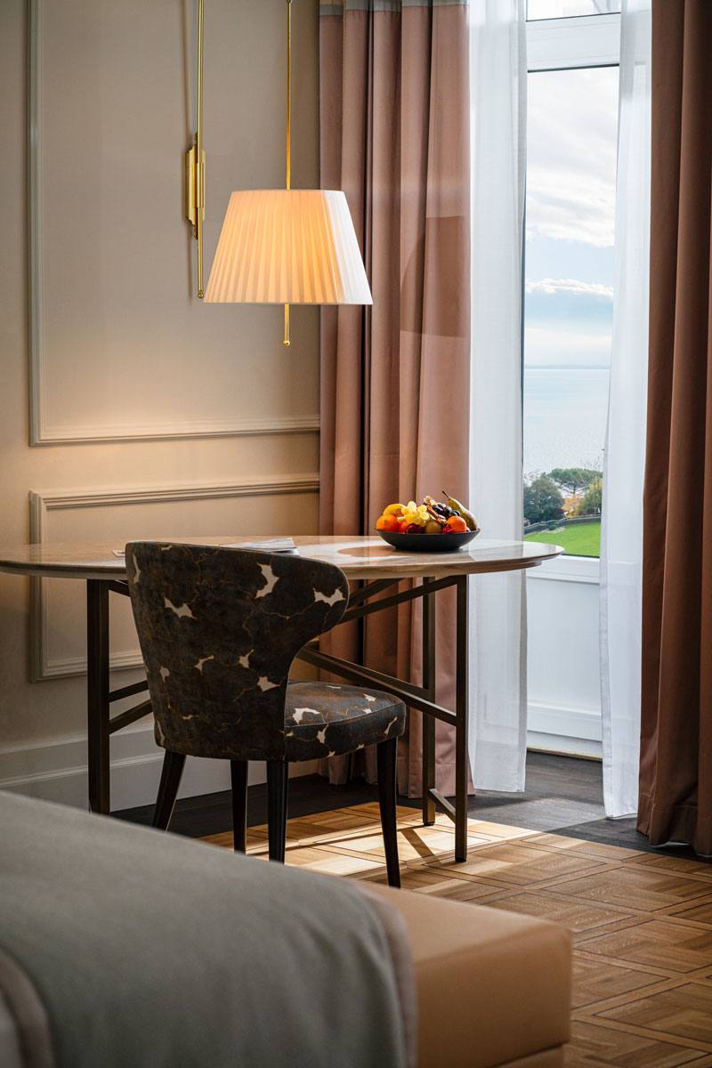 The renovation project of the Swiss property draws inspiration from the breathtaking beauty of Lake Geneva and the hotel’s majestic architecture. Meticulous attention to detail has been the cornerstone, seamlessly integrating the essence of the surroundings into every design aspect.