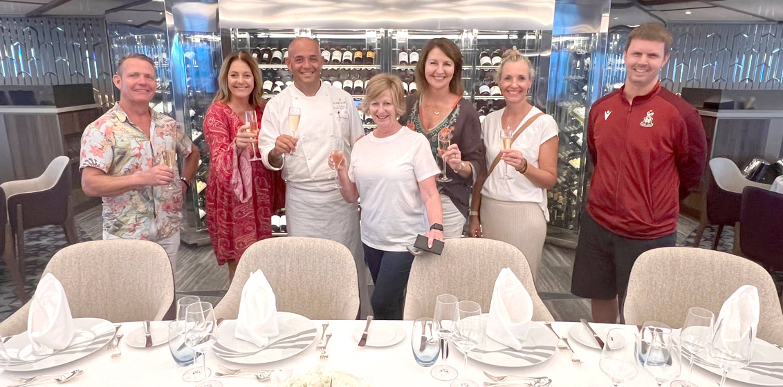 Pictured in The Restaurant of Seabourn Pursuit from left are: Ross Quigly, Luxury Cruise Escapes; Megan Catterall, LUXE by itravel, Executive Chef JP Keane; Sue Okmasich, Unley Park Travel; Jennifer Compton, Seabourn; Nicole Reber, Mosman Travel and Richard Muff, Off the Beaten Track Travel.
