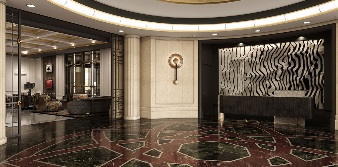 The entrance retains the hotel’s original stonework, complemented by black marble stone and wood at the bell desk, black accent paint at the curvilinear walls and ceiling detail, and adornments of metallic gold.