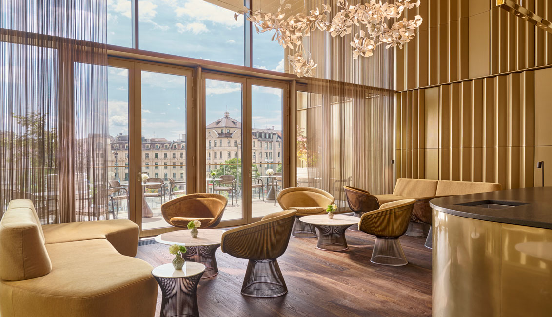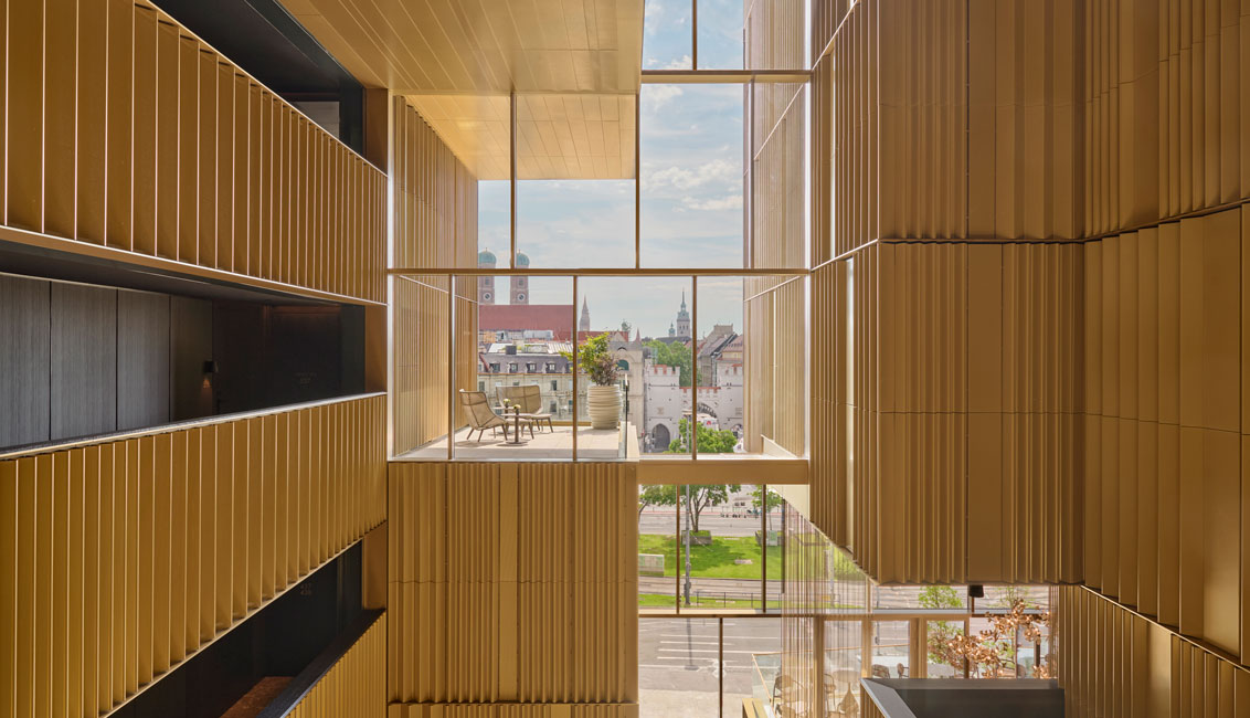 Upon arrival, guests are welcomed into a breathtaking, spacious atrium introducing the hotel’s design concept of “Stachus Serenity”, reflecting individuality and local connectivity. Through the implementation of louvered structures and large, gold-coloured walls, the architectural approach was to open the facade towards the “Stachus” square and establish a connection between the interior and exterior of the hotel, creating a luxury urban retreat.