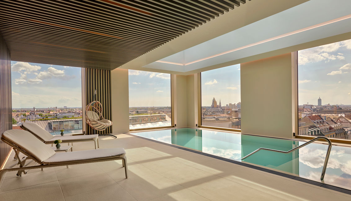 Koenigshof’s crowning jewel is the 250-square-metre split-level Presidential Suite on the eighth and ninth floor offering an ultimate luxury experience. As the largest hotel suite in the city, it boasts a private sauna and a pool with breathtaking city views. The pool features a counter-current system and seating surfaces with massage jets. A private spa offers high-quality spa products, a relaxation area and lounge with a Smart TV, and a curated room service menu for complete relaxation.